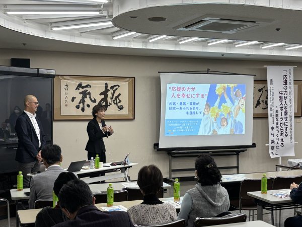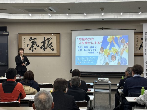 11月21日(金)富山県総合体育センターにおいて、当協議会の指導者研修会を開催しました。講師は富山県チアリーディング協会の会長でチアリーディングチーム「puppys」の代表を務める『小竹 美夏』先生です。演題は、「”応援の力が人を幸せにする”生涯スポーツから考える~素敵なまちづくりとは~」です。小竹先生は神奈川県のお生まれで、日本中にチアを広めたいとの思いから20年前に富山に移住することを決意されたそうです。ジュニアチームの「puppys」を立ち上げ、これまでに富山マラソンなど、県内の多くイベントで応援活動を続けてこられました。またpuppysを全国的・国際的な大会で活躍できる日本を代表するチームに育て上げられました。何よりもベストマナー賞を継続的に受賞する人間力の育成には、心から敬意を表したいと思います。研修会では、先生の生い立ちから富山に移住することに至った経緯、チームづくりやコミュニティづくり、子供たちや保護者との関り合い、自分との向き合い方等、多くのことを学ぶことができました。またゲストスピーカーとして同行していただいた社会教育士の「佐治 直」氏から、puppysのコンセプトを中心に多世代でインクルーシブなまちづくりについても、県内の実例をもとにお話しいただきました。